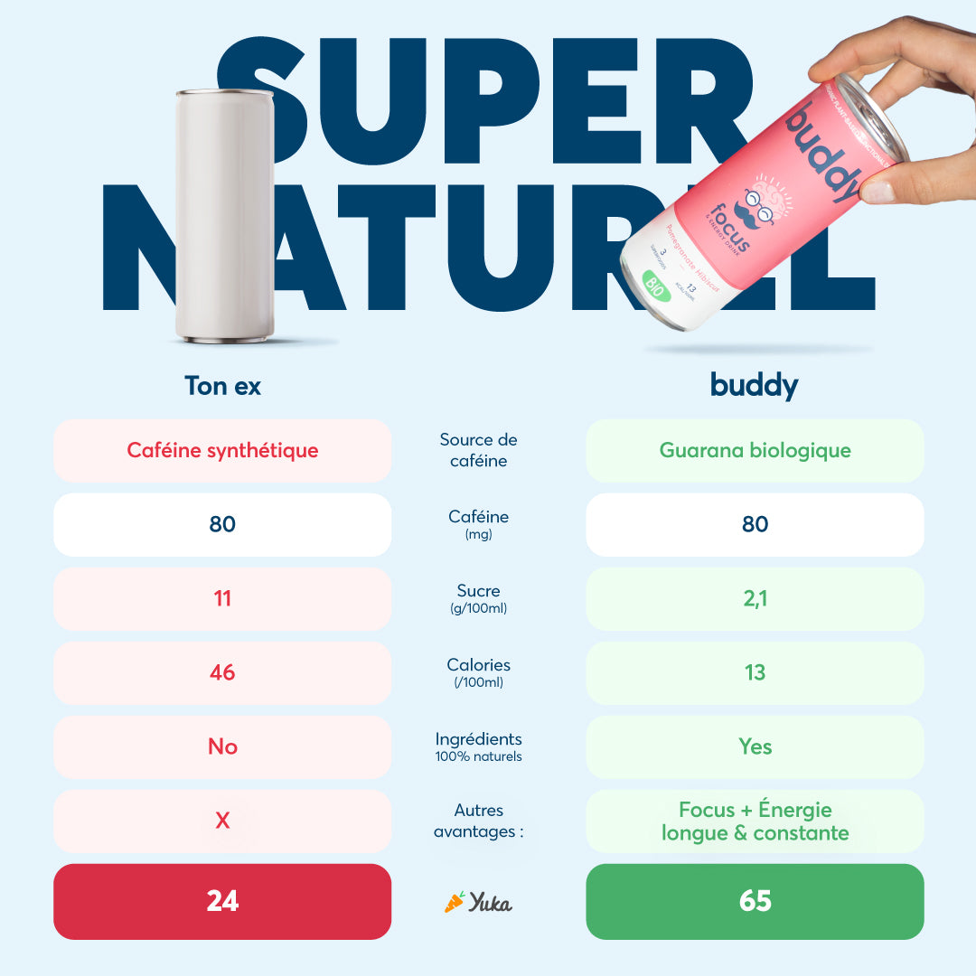 Buddy goes beyond just being an energy drink; it's your healthy solution, backed by informed choices and an outstanding score of 65 on Yuka.